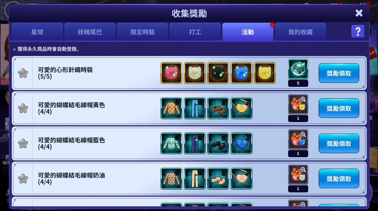 - 獲得符合每個收集獎勵的時裝,當符合條件時,就可以獲得收集獎勵。