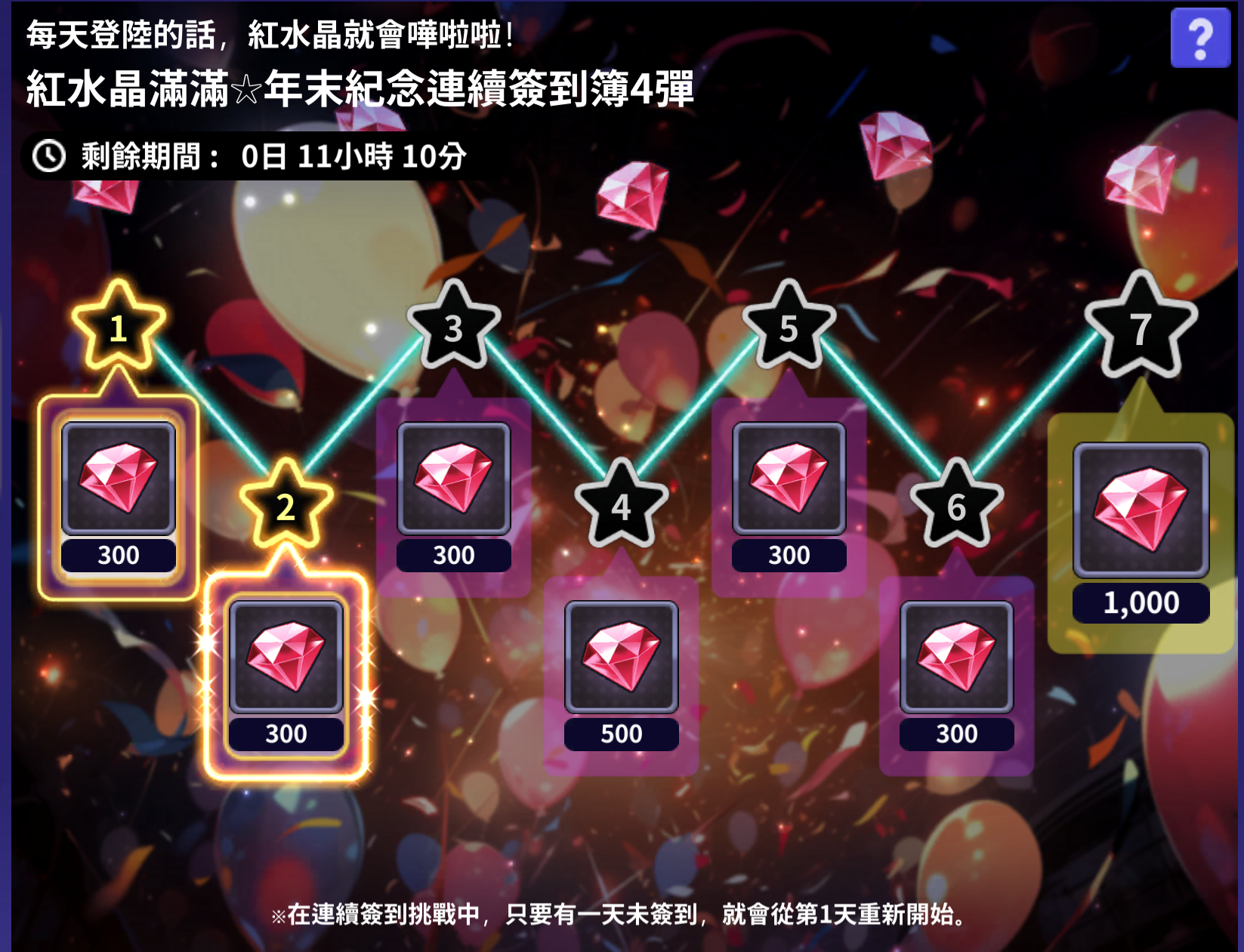- 連續簽到時可以獲得下一次簽到獎勵。