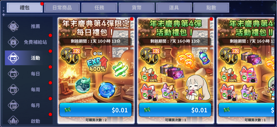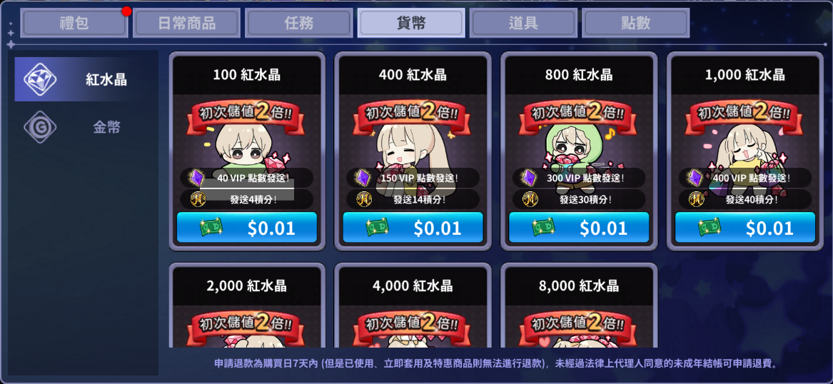 - 只要購買下方活動禮包及儲值紅水晶, 就可以獲得2倍積分