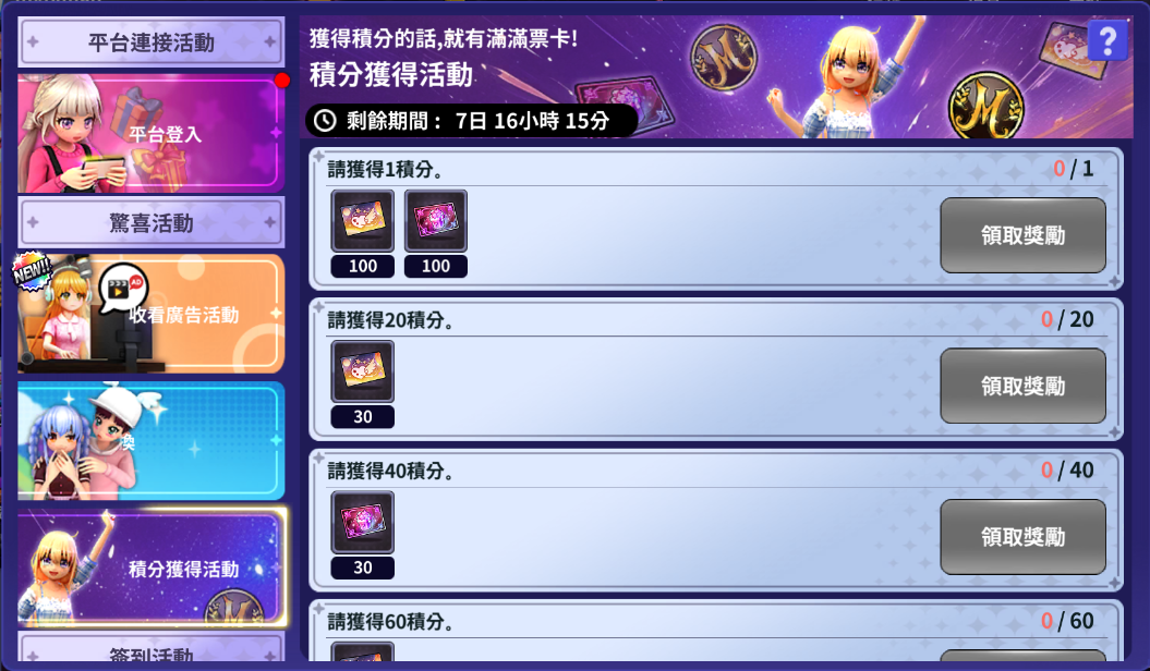 另外還有積分任務,每達到目標積分就可以額外獲得豐富票卡!