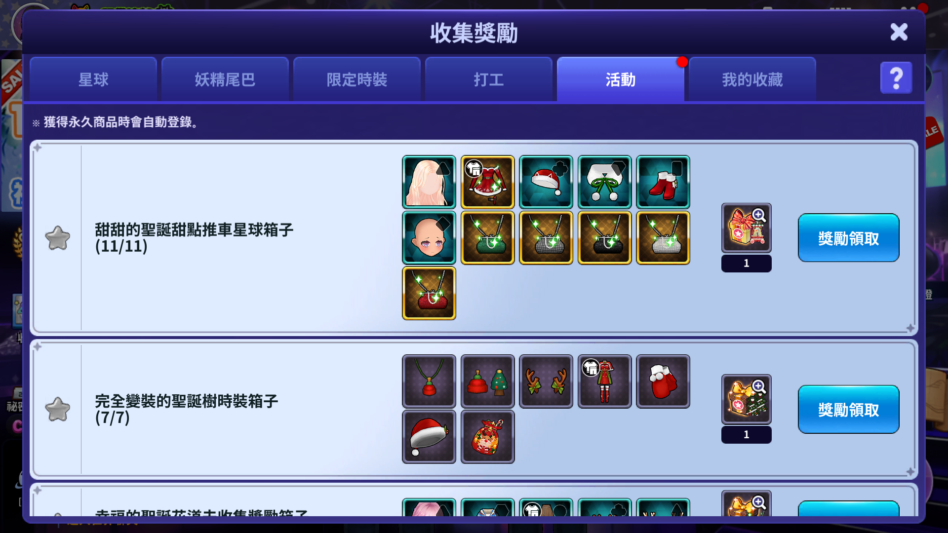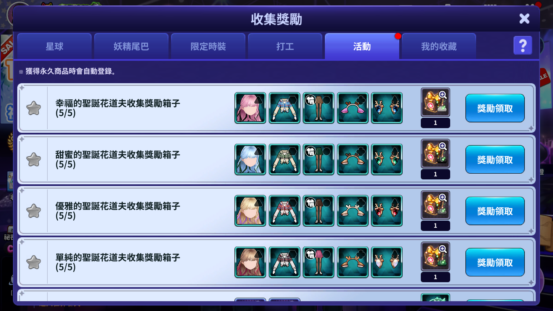 - 獲得符合每個收集獎勵的時裝,當符合條件時,就可以獲得收集獎勵。