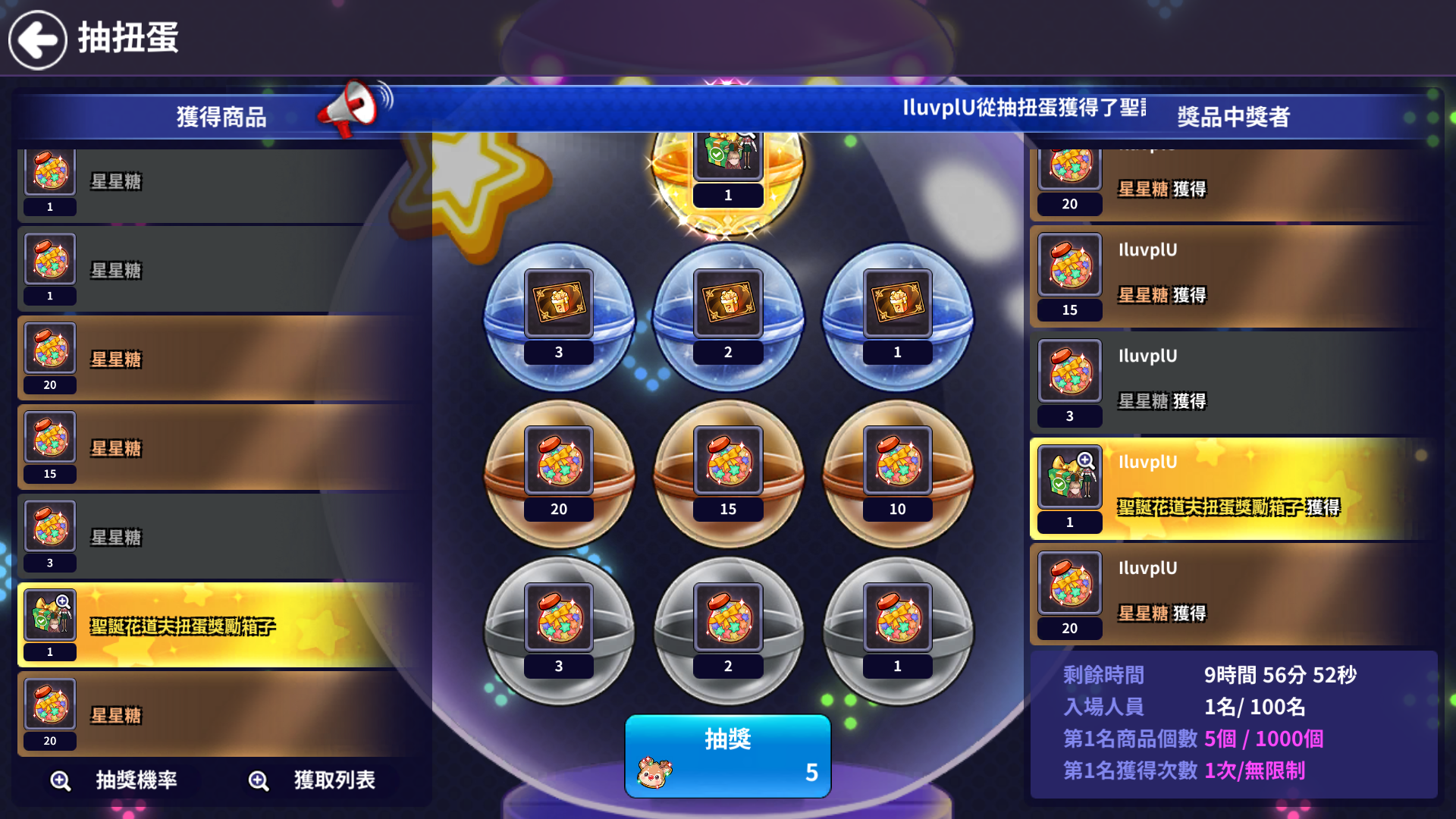 - 1等商品限定的數量全部消耗或進行時間截止時,抽扭蛋也跟著結束。