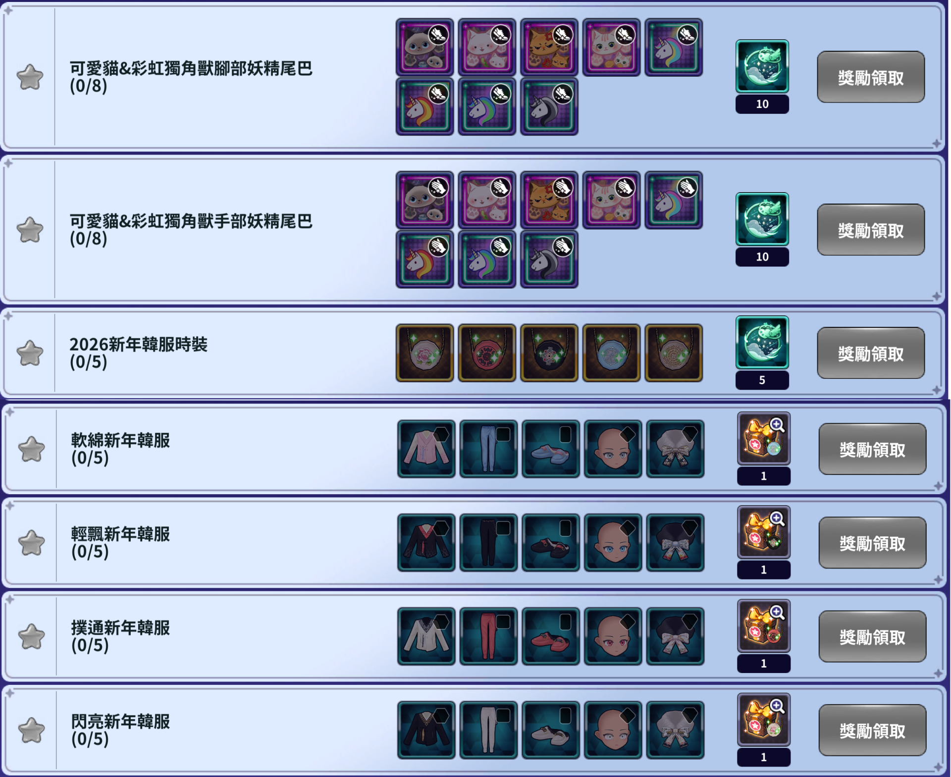 - 獲得符合每個收集獎勵的時裝,當符合條件時,就可以獲得收集獎勵。