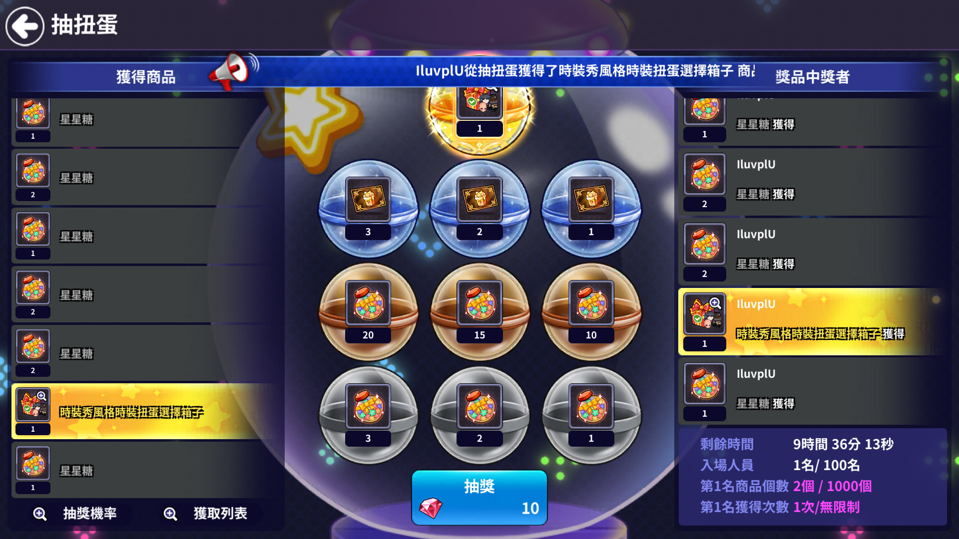 - 進入抽扭蛋房間後,10秒內未進行抽扭蛋時,將自動退出抽扭蛋房間。