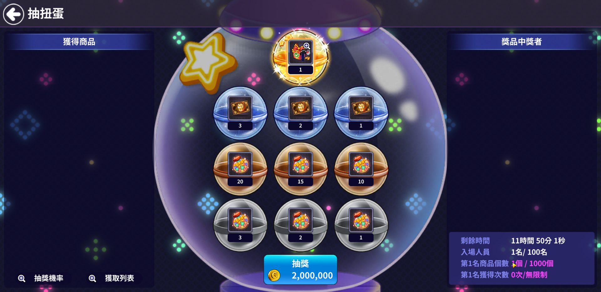 - 1等商品限定的數量全部消耗或進行時間截止時,抽扭蛋也跟著結束。