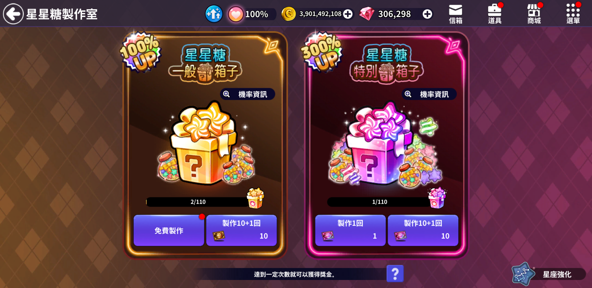 - 星星糖製作室進行抽卡時,星星糖一般箱子100% & 特別箱子300% UP。
