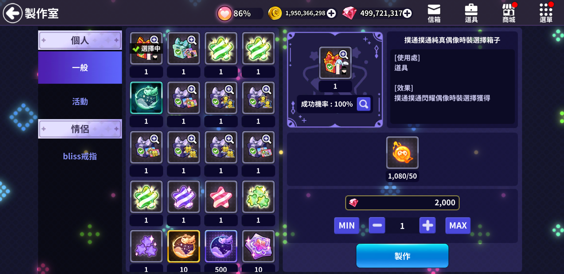 1 | 夜空中閃耀的十二之星北河星團隊 | 두근두근 빛나는 아이돌 코스튬 랜덤 박스 撲通撲通純真偶像時裝隨機箱子 | 1 | 1 | 李安 | 2key_easy | ~100 | 두근두근 빛나는 아이돌 코인 | 1 |