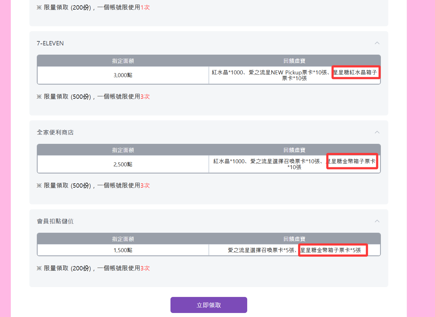 | 星星糖金幣箱子票卡 | 星星糖一般箱子票卡 |