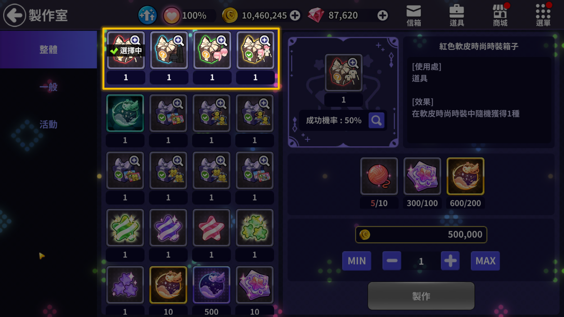 | 藍色軟皮時尚時裝箱子 1個 | 50% | 藍線球 10個 名人幣 100個 甜蜜紅色糖果 2個 500,000 金幣 |