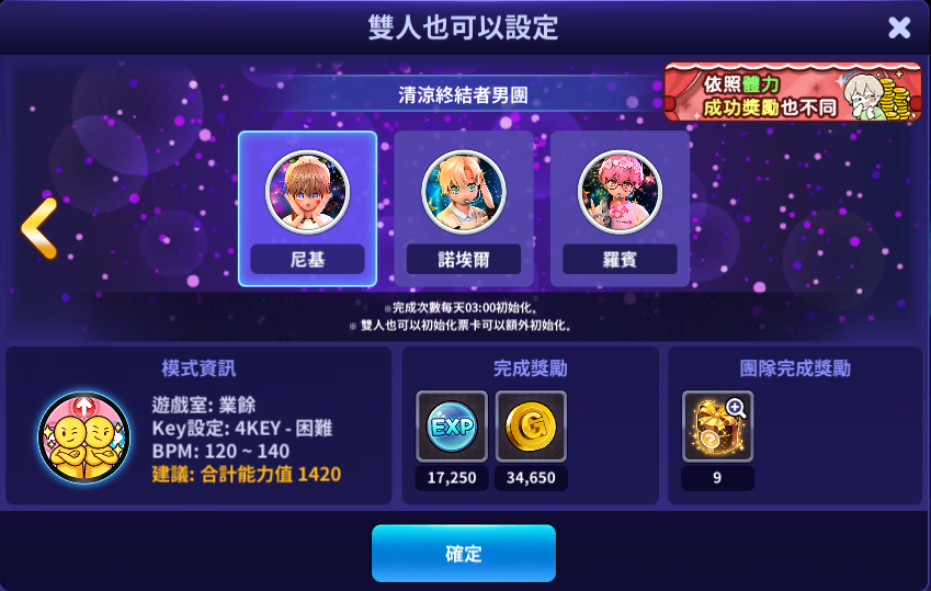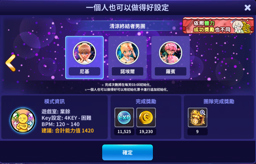 7 | (NEW) 清涼終結者男團 | 혼자서도 잘해요 보상 박스 | 9 | 1 | 阿梅利亞 | 4key_hard | 120~140 | 1420 |