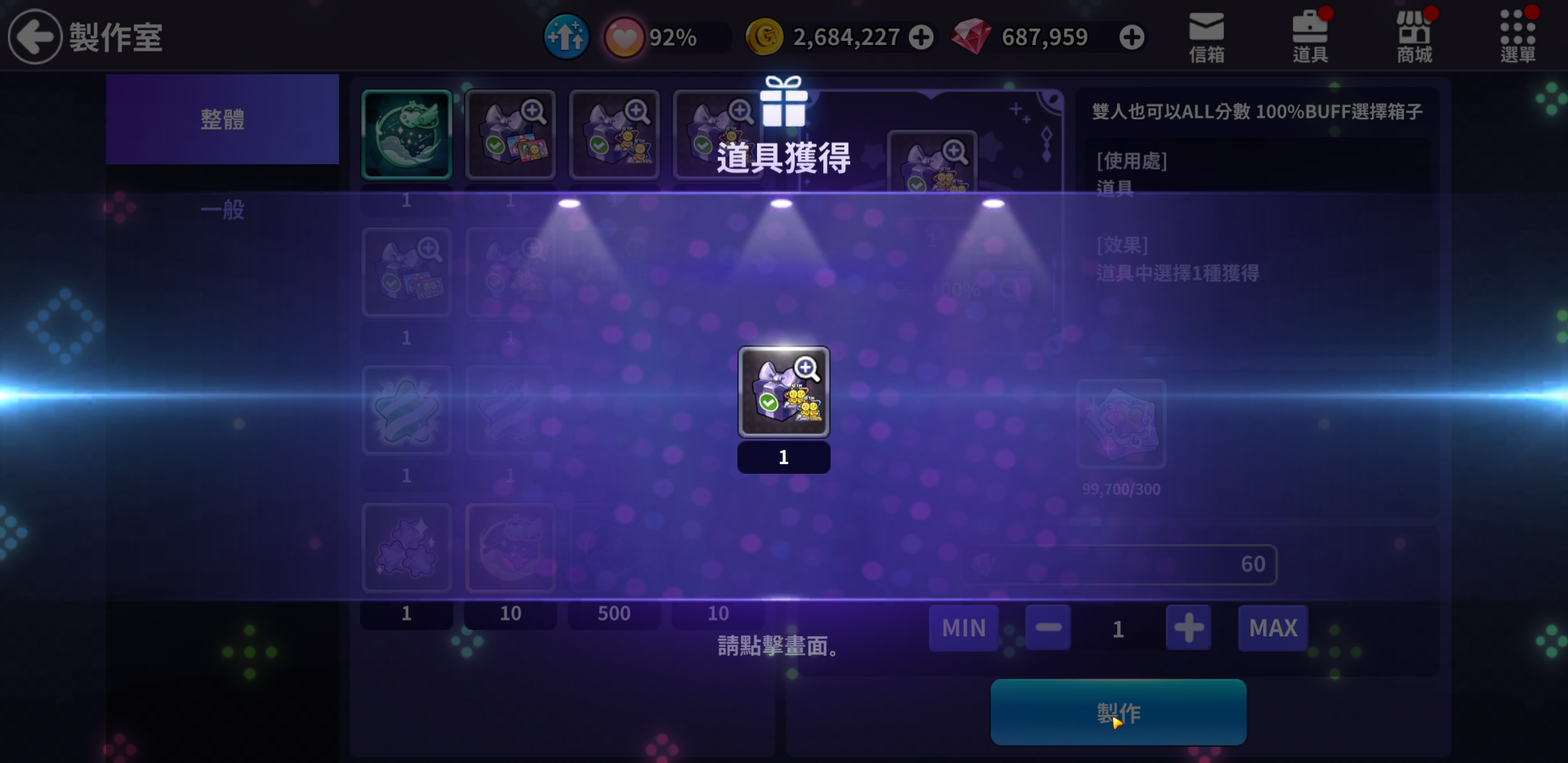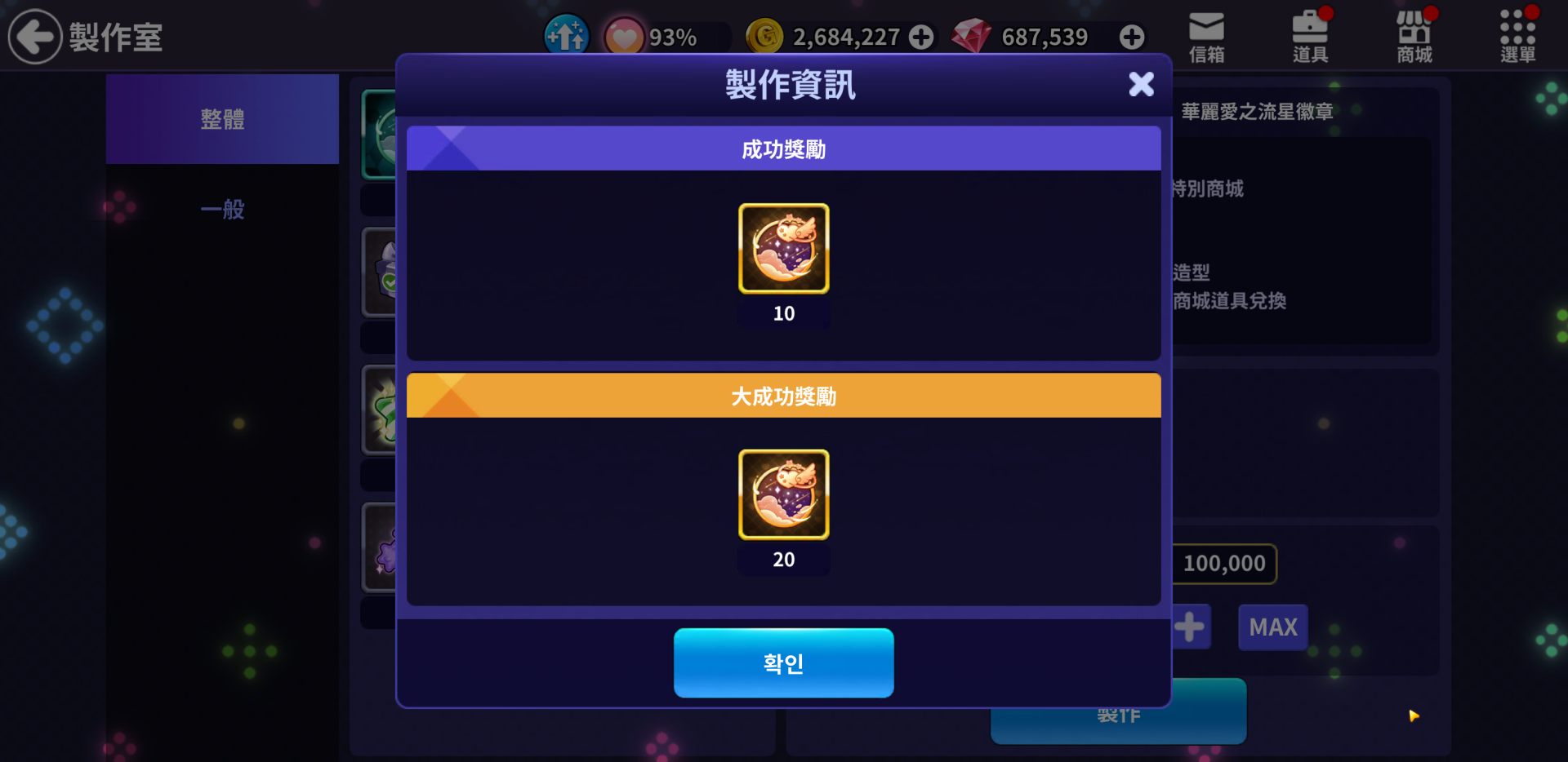 📌製作時一定機率會"大成功"發生,大成功可獲得額外獎勵。