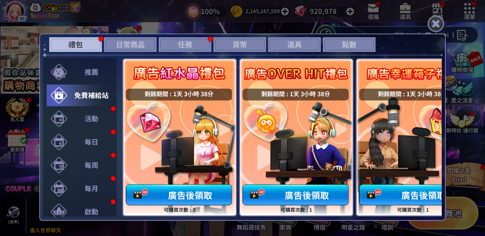| 免費補給站 | 明日之星自動進行 | 直播秀 |