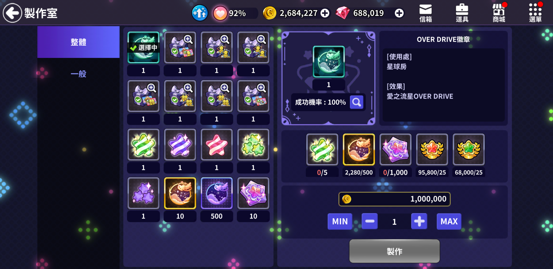 📌強化成功率因OVER DRIVE等級而異,失敗時僅消耗道具,維持等級。